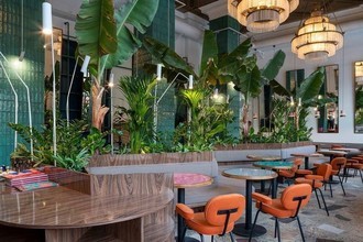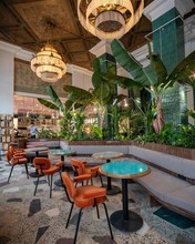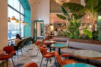 В интерьер добавлены яркие акценты - мягкие стулья насыщенного оранжевого и розового цвета, а также много живых растений. Гостям будет комфортно за уютными круглыми столиками. Всего в заведении 63 посадочных места.